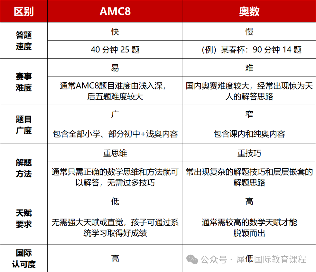 对比传统奥数偏重技巧和超前学习,AMC8知识体系与校内课程衔接紧密,更多考察逻辑思维、阅读理解能力和解决实际问题的能力。