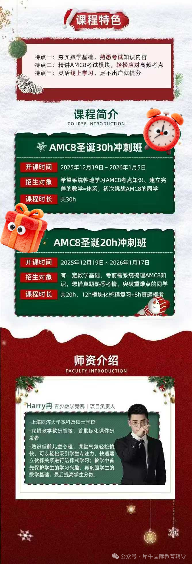 想让孩子在AMC8竞赛中冲刺前5%、冲击前1%?优质的AMC8竞赛冲刺课程是关键!AMC8竞赛作为全球认可的数学赛事,不仅能提升孩子的逻辑思维,更是小升初的亮眼加分项,选对AMC8培训课程,能让备考少走弯路。犀牛教育AMC8竞赛冲刺课程,线上线下课表已出!