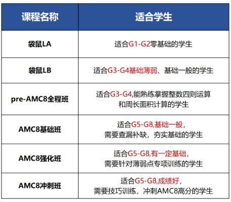 犀牛针对AMC8和袋鼠数学竞赛均设有多个班型的辅导课程,完善的课程体系让1~8年级学生均有匹配的课程内容。