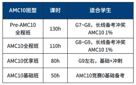AMC10班型设置:Pre-amc10全程班、AMC10全程班、AMC10优享班、AMC10基础班