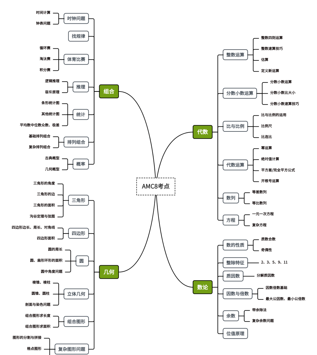 AMC8竞赛考点内容范围广,覆盖8年级以下知识点,整体可分为4大模块。