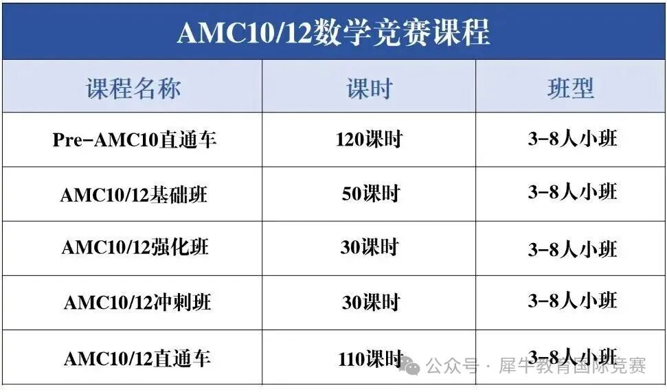 AMC10/12竞赛正是备考黄金期,犀牛新赛季AMC10/12竞赛培训课程安排已出,根据学生基础选择适合的班型,全国30+线下校区分布,可提供线上/线下同步培训辅导课程!