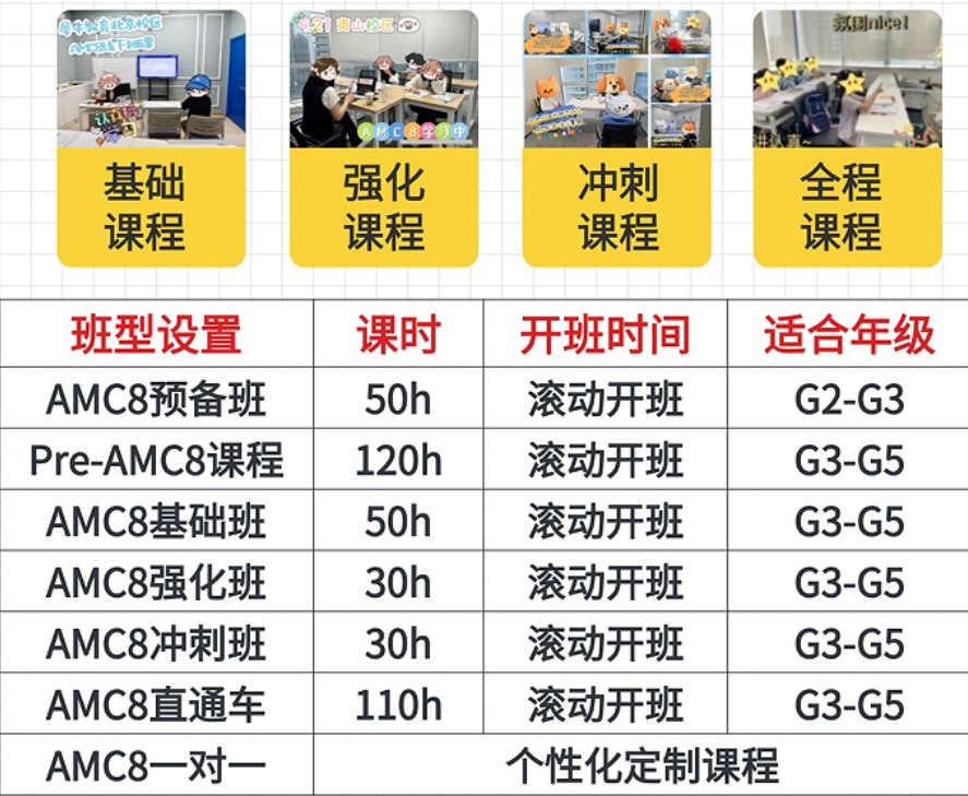 AMC8课程班型:根据参加AMC8竞赛的学生年级不同,基础水平不同,分别开设了PreAMC8全程班,AMC8全程班,AMC8优享班,预备基础-强化-冲刺不同阶段的课程全含,根据前测成绩,按孩子基础分配最合适的班级。