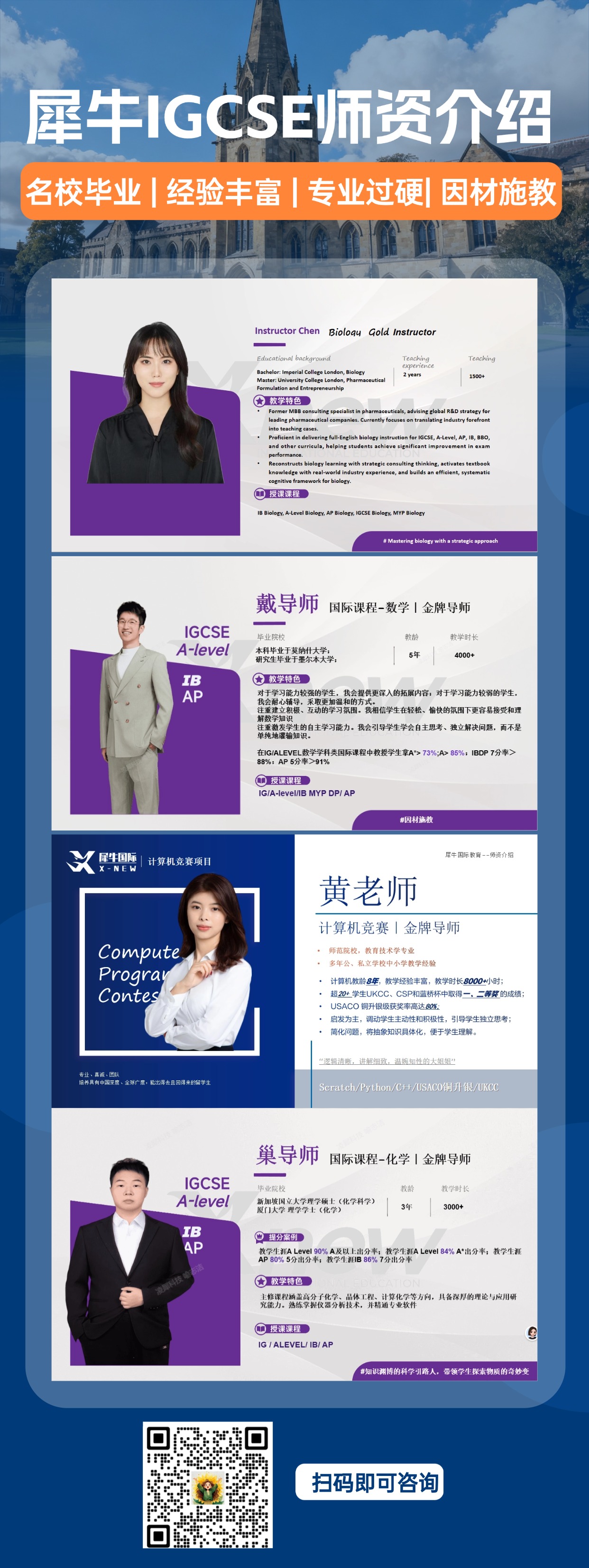 犀牛国际教育的IG授课老师多毕业于剑桥、加州理工、清北复交、新加坡国立等世界顶尖院校,专业功底扎实。