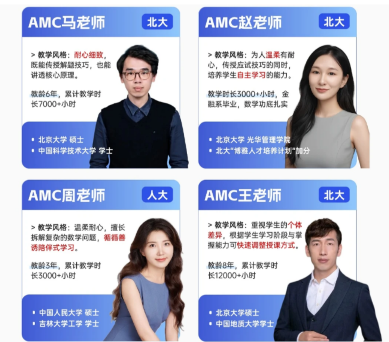 名校毕业资深竞赛导师:犀牛AMC8培训师资均是名校毕业,斯坦福、港大、复旦名师可以灵活选择,AMC竞赛教龄5年以上,善于发现学生薄弱点,教会学生学习简便路径,高效提升成绩。