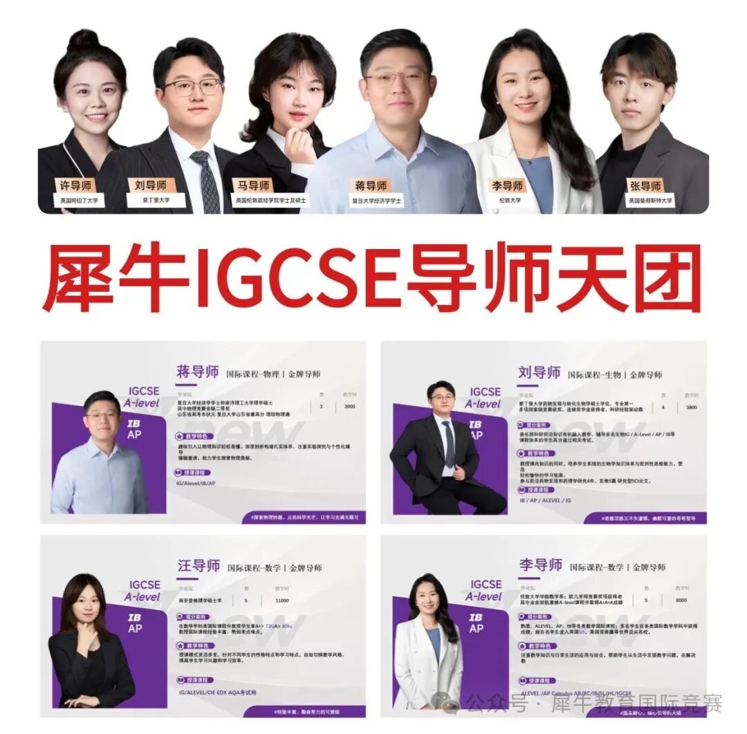 犀牛的IG授课师资汇聚海内外名师授课背景,包含斯坦福大学、香港理工大学、清北复交、UCL、帝国理工等学校教育背景老师。不仅熟知IG考纲,还有众多考试技巧可以帮助学生更高效的备考IG。