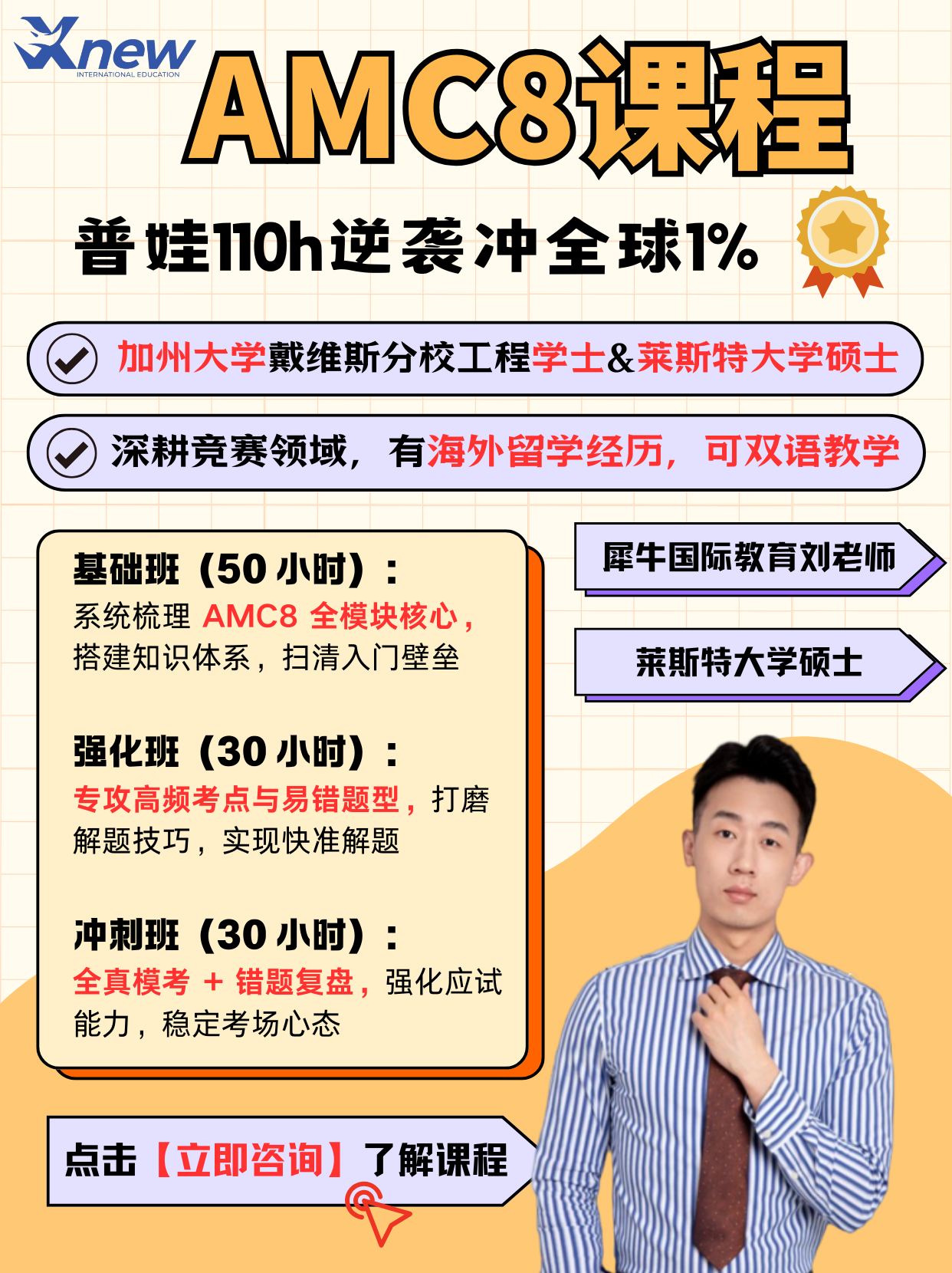 作为深耕国际竞赛辅导多年的知名机构,犀牛国际教育精准契合以上选择标准,深耕成都AMC8辅导与AMC8培训领域,依托全球教研资源和成都本地教学优势,为成都学生打造全方位的AMC8课程解决方案,成为成都AMC8辅导领域的标杆品牌。犀牛国际教育在全球布局40+校区,其中成都两大校区凭借优质教学服务,赢得了众多家庭的认可。在师资方面,成都犀牛国际教育的AMC8辅导导师实力雄厚,均来自清北、牛剑、藤校等顶尖院校,80%毕业于QS世界排名前50院校,其中不乏深耕AMC8辅导的金牌导师,平均教龄5年以上、授课2000+小时,不仅熟悉AMC8命题趋势,更了解成都学生的学习特点和本地升学需求,擅长用启发式教学拆解竞赛难点,传授高效解题技巧,助力学生快速适配AMC8的思维模式,打破“通用教案脱离本地考情”的弊端,这也是犀牛国际教育在成都AMC8辅导领域脱颖而出的核心优势。