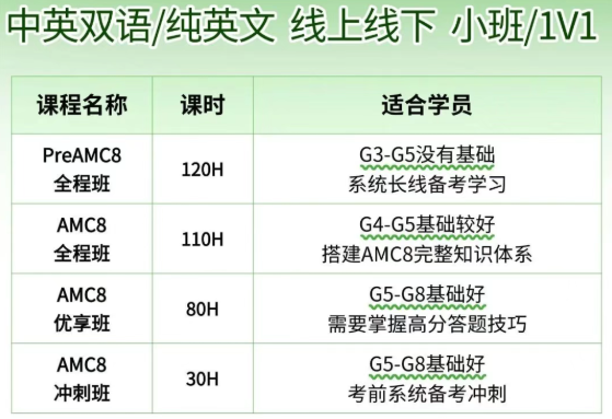 AMC8竞赛想拿前1%或前5%,离不开专业的课程辅导。犀牛国际教育深耕AMC8竞赛多年,针对27年AMC8竞赛,开设了AMC8辅导班,包括PreAMC8全程班,AMC8全程班,AMC8优享班,AMC8强化冲刺班,适合不同基础,不同年级的学生。