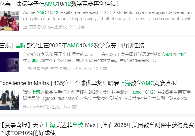 上海国际学校学生往往把握国际教育新风向,上海世外,康德双语,上实剑桥,杨浦双语国际高中,哈罗等学校都鼓励学生参加AMC12竞赛。
