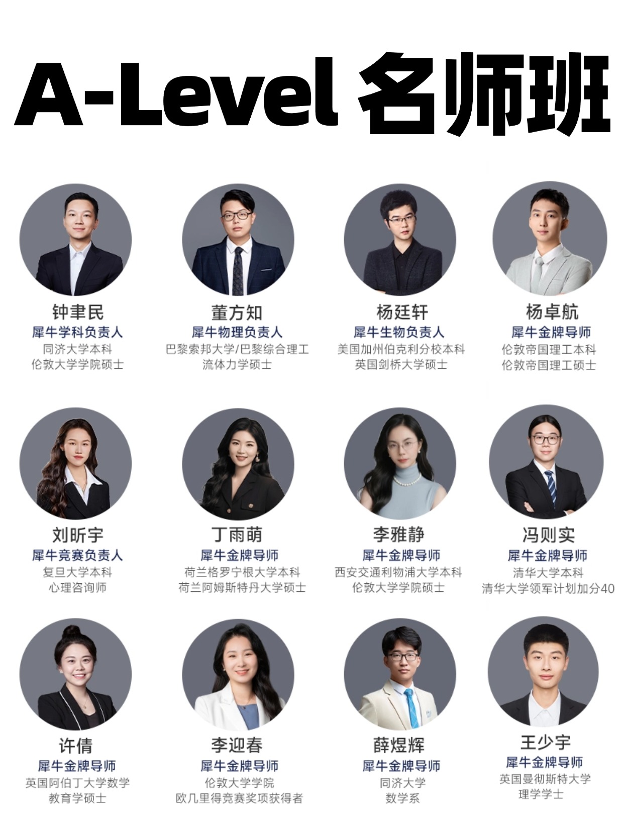 犀牛Alevel课程师资团队是核心竞争力,老师均毕业于牛剑、G5、QS前50名校,人均多年Alevel课程教学经验,对三大考试局的命题规律与评分标准了如指掌,能够精准把握拿分要点