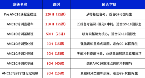 由于备考AMC10的学生基础不同,因此我们设置了多种班型,可以先给孩子做个基础测试,根据结果来匹配最适合的课程!